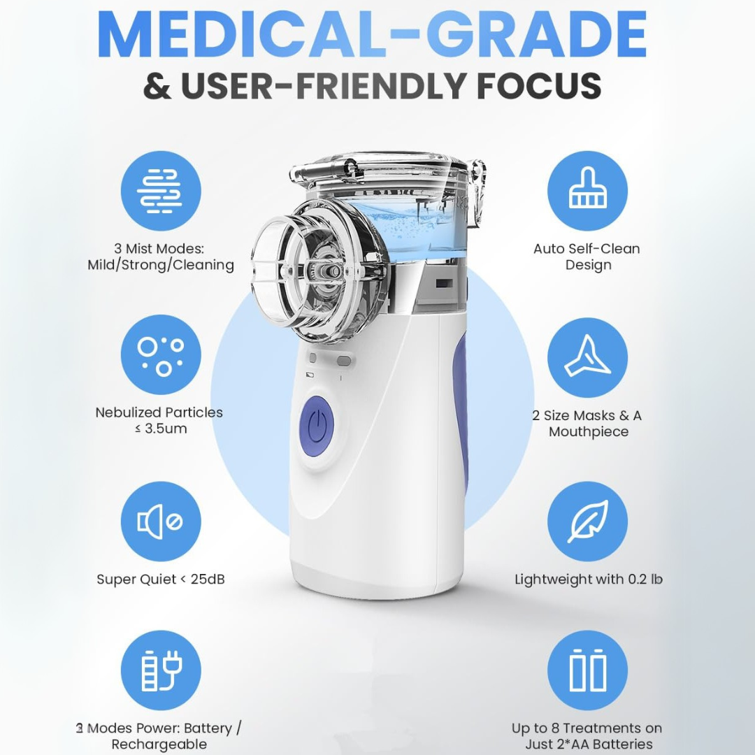 It transforms liquid medication into an ultra-fine mist that travels deep into your lungs, delivering fast, effective relief without the noise, cords, or setup of traditional machines.